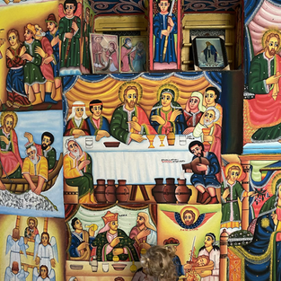 The first port of call was Ura Kidane Mihret Monastery set on the Zege Peninsula. To get there we walked from the jetty about 15 minutes and I was ever so grateful that Eddie carried Tiger for quite a bit of the way. The monastery was founded in the 14th century by a priest called Betre Maryam. The circular church was built in the 16th century, and its walls are covered in murals painted between 250 and 100 years ago. The museum nearby had some incredible leather bound Bibles, crafted using animal skin which I was quite fascinated by.